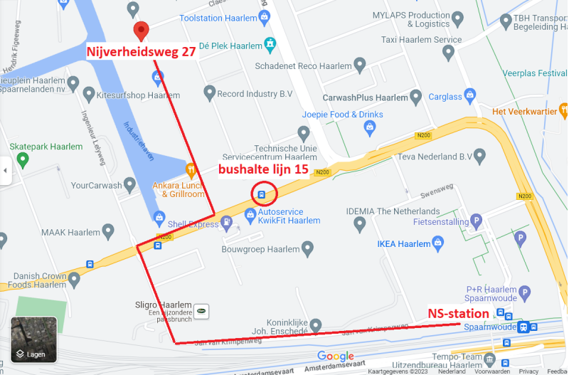 Bus: Lijn 15 rijdt alleen door de week. Opstappen op NS-station Haarlem-Spaarnwoude, uitstappen bij halte “Nijverheidsweg”, vanaf daar 7 min. lopen.